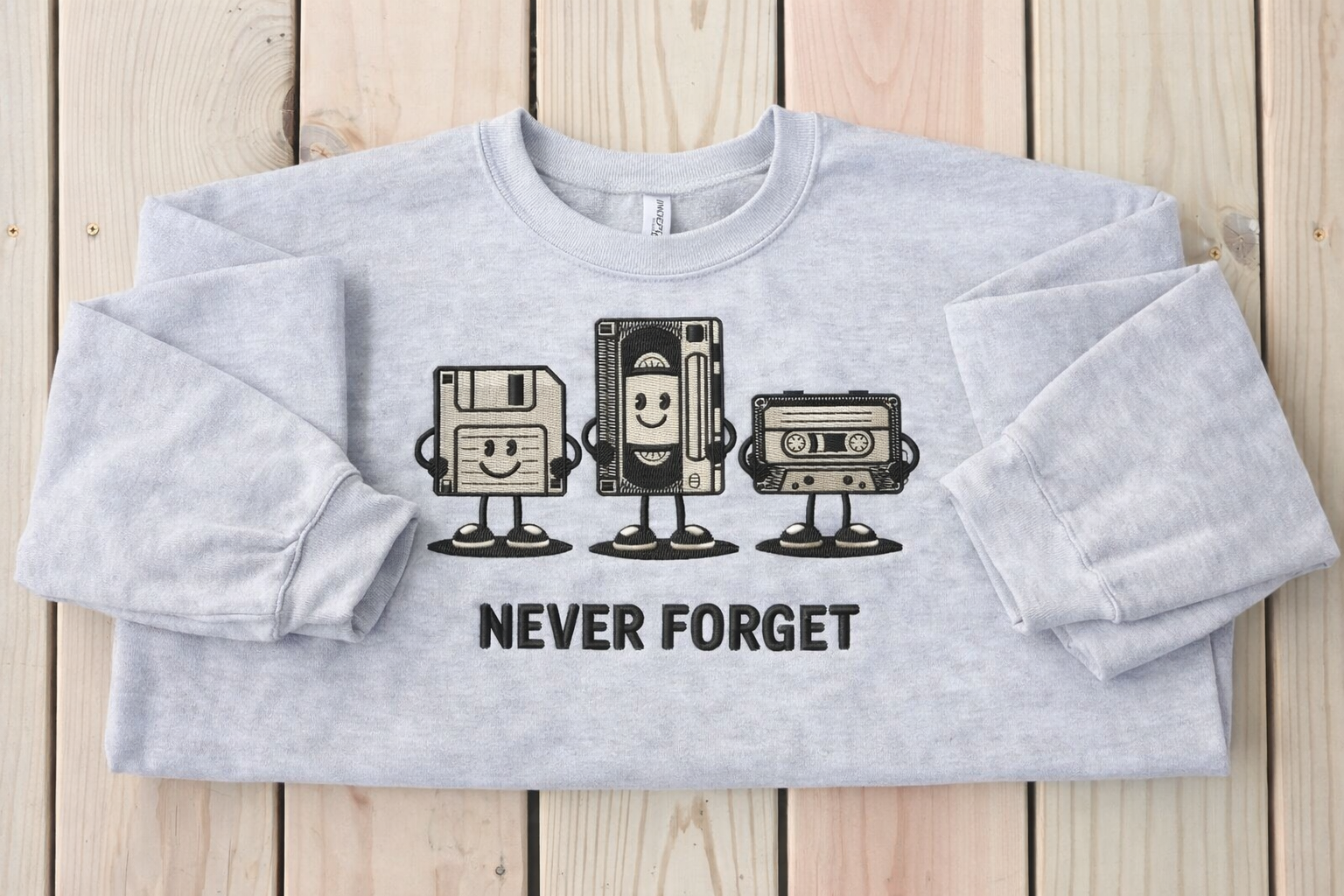 Celebrate the golden age of tech with this cozy, nostalgia-packed sweatshirt. Featuring three iconic throwbacks—a floppy disk, VHS tape, and cassette—each brought to life with playful character designs, this piece is a must-have for anyone who remembers (or loves) the analog era. Finished with the bold phrase “Never Forget”, it’s a fun tribute to the media that shaped a generation.